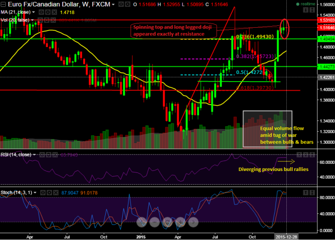 As you can observe spinning top and doji on weekly charts has occurred exactly at resistance around 1.53 levels that is to be considered as a caution of previous of upswings.