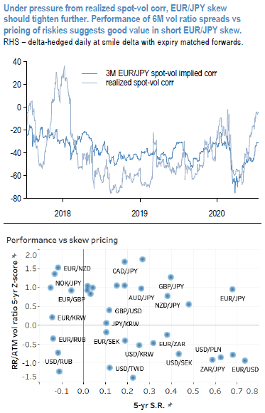 Moreover, our analysts look for the yen to remain flat to the dollar through 2H’20, with a bias for moderate JPY appreciation only through early 2021. If those expectations realize yen skew is bound to underperform. With the recent focus on EUR outperformance as EURUSD crossed 1.14 levels, we see EURJPY skews a good place to skim the leftover x-yen