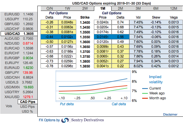 At spot reference: 1.3606 level, 1M ATM IVs are trading a shy above 7.45% - 8.02%, skews are also suggesting the odds on OTM call strikes upto 1.3850 levels at this juncture. We could also notice bullish risk reversals additions of this tenor that signals further upside risks in the risk-neutral distribution of returns. Also, the IV curve is at, or slightly decreasing, with maturity.