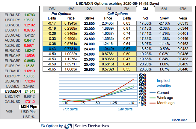 Buy 3M USDMXN ATM/25D 1*1.5 vol ratio call spread vs 22.80/25.77 indicative, (spot reference: 24.3020 levels). Courtesy: Sentry & Commerzbank