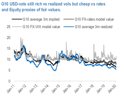 A couple of observations regarding current pricing of vols against market factors are presented (refer 1stdiagram). The chart displays how, at least for G10 USD vols, current vol levels still command on average a premium vs realized vols, while appearing as cheap vs two cross-asset fair value analyses (vs Rates and Equity vols).