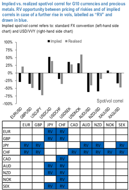For instance, last week when suggesting bearish structures on EUR and GBP, we favoured closer to the money strikes on USDJPY, implying higher premia but better entry points in terms of higher implied correlation (refer 2nd chart). CHF/ccy USD-implied correlations are positive at present.