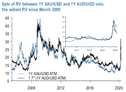 Well, AUD retraced 75% of the March spike gold vol has materially lagged completing only about 30% of the retracement. Accounting for the difference in the vol beta and correspondingly scaling up AUD vols (e.g. for 1Y tenor by 1.7X) results in nearly identical Feb-March vol spike (1-yr chart in the above chart).