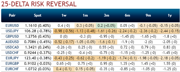 EURUSD risk reversals have still been indicating the hedging sentiments for the bearish risks in the long run, as the fresh negative bids are added to the positive RRs for 1-3m tenors (1st chart).