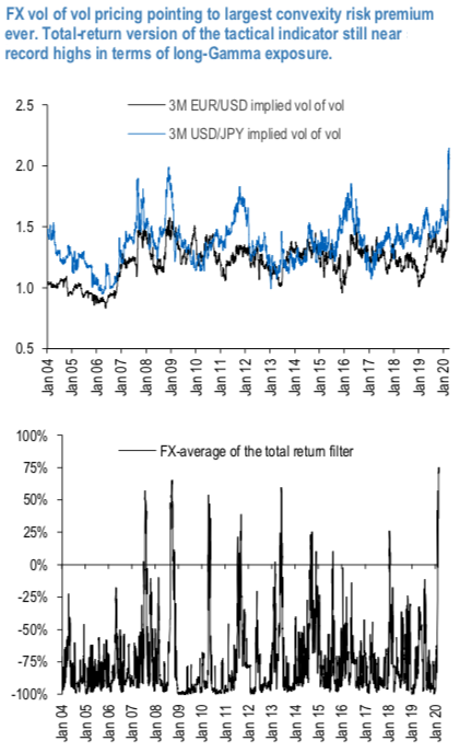 This picture is fully consistent with the results of a tactical model for vol trading (Total-return version of tactical filter allowing long Gamma trades), whose recommended long-Gamma signals is highest on record (refer 1stchart), after averaging over USD G10 and EM pairs, again surpassing the GFC and European debt crisis. The model relies on a set of common global indicators and other variables that depend on each vol smile. At present, 4 of the global indicators (Ted spreads, VIX, Gold/Silver and VXY) indicate a risk-off market, with only US swaptions pointing to benign sentiment.