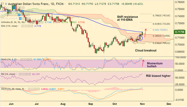 - The pair is now testing 110-EMA at 0.7178, break above to see upside till 61.8% Fib at 0.7312.