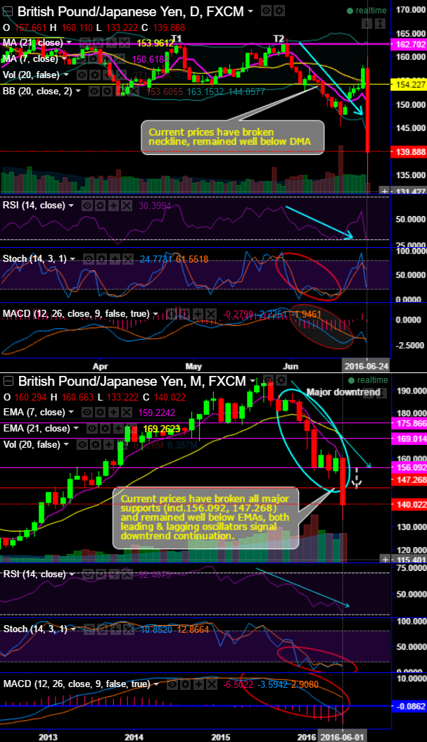 The current prices of GBPJPY have broken all major supports on monthly charts (including156.092, 147.268) and remained well below EMAs, both leading & lagging oscillators signal downtrend continuation.