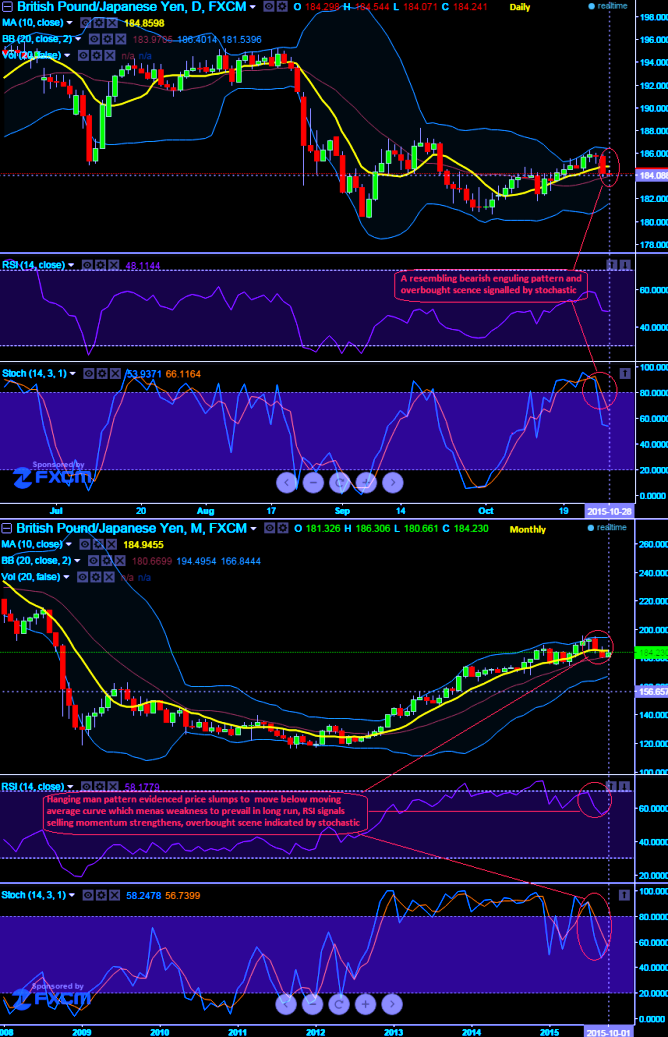 Now, it was urged for some corrections on GBPJPY upon the formation of "Gravestone Doji" pattern candle on peaks of uptrend at around 183.926 levels on daily chart followed by a shooting star at 184.079. Hanging man with downward convergence of leading oscillators is again bearish note on monthly chart. It is also important to emphasize that a hanging man candle pattern on monthly chart is a warning of potential price change, not a signal, in and of itself, to go short.