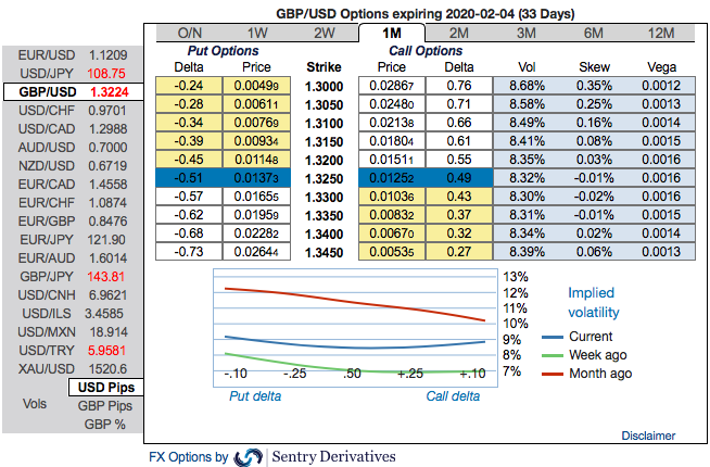 Strategy (Debit Put Spread): Contemplating above factors, wise to deploy diagonal options strategy by adding short sterling via a limited loss tail hedge: Stay short a 1M/3W GBPUSD bear put spread (1.3425/1.27), spot reference: 1.3205 level.
