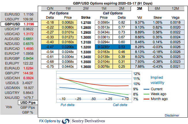 Strategy (Debit Put Spread): Contemplating above factors, wise to stay short sterling via a limited loss tail hedge: Stay short a 2M/2W GBPUSD bear put spread (1.3425/1.27), spot reference: 1.3205 level.