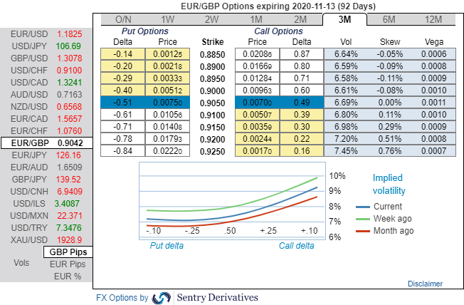 The positively skewed IVs of 3m tenors are indicating upside risks, more bids are observed for OTM call strikes up to 0.9250 levels.
