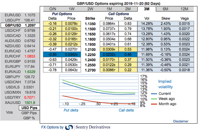 Stay short sterling via a limited loss tail hedge: Stay short a 2M GBPUSD 30d/10d bear put spread on August 2nd(spot reference: 1.2088 level). Paid 0.66%. Marked at +0.74%. Courtesy: Sentrix, Saxo & Commerzbank