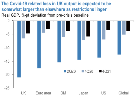 In addition, the damage to UK public finances will be quite a bit worse than initially assumed, not least because of the scale and open-ended duration of the government’s furlough scheme that is now paying one-in-every four private sector workers. The budget deficit is now projected at 16% of GDP - this may not be the worst in G10 (the US is expected to push 20%), but is certainly larger than most.