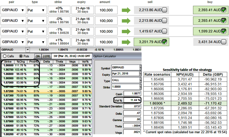 So, here goes the strategy this way, At spot ref: 1.8675, go long in 2 lots 1M ATM -0.50 delta puts, long in 2M (1%) OTM -0.35 delta put, and simultaneously short 2W (1%) ITM shorts, the spread is to be executed in the ratio of 3:1with net delta at around -0.70