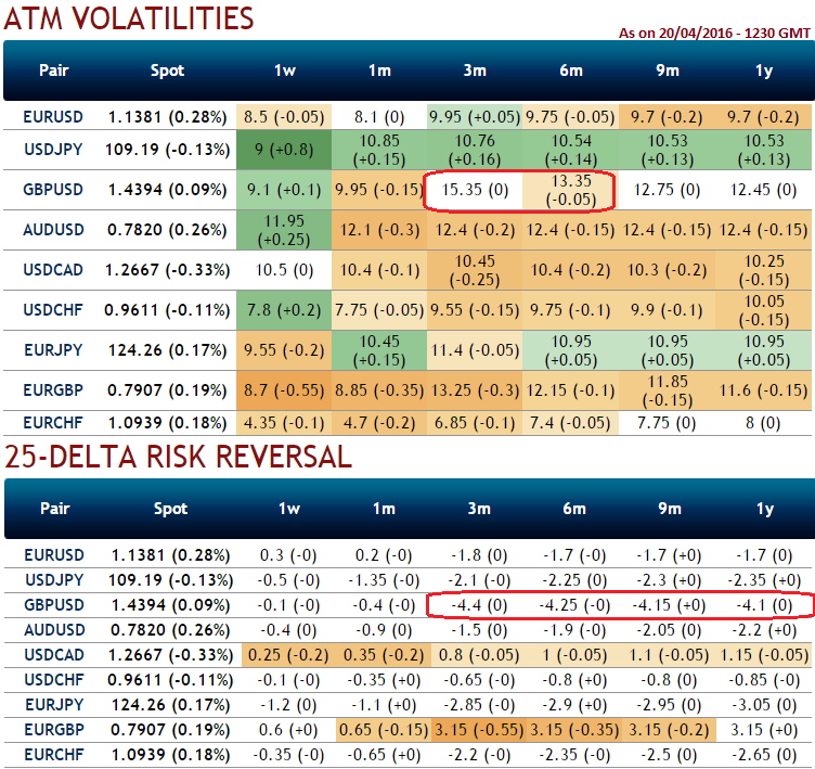 Risk reversals: Demand for GBP puts/USD calls have been consistently growing on fears of UK exit from the EU.