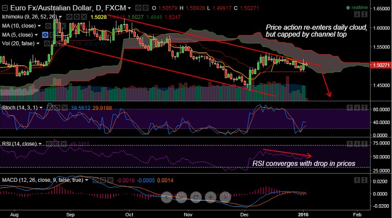 EUR/AUD price action re-enters daily cloud, but trend is definitely lower.