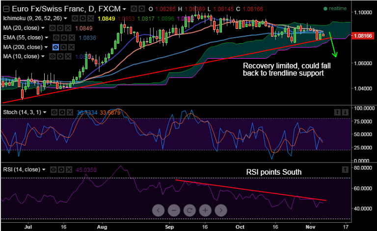 EUR/CHF is currently trading at 1.0817, with strong resistance seen at 1.0850/55 (Tenkan & 21 DMA). Intraday recovery attempts in EUR/CHF are limited, pair could fall back to trendline support at 1.0787.