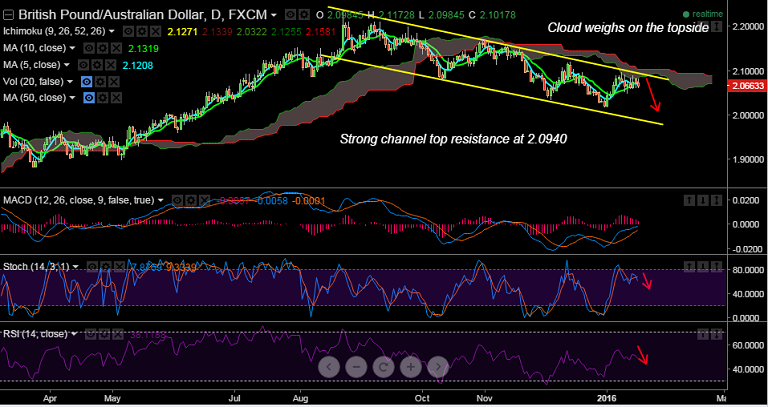 - The pair has been trading a falling channel since August, 2.0940 is strong resistance, daily cloud also weighs on the topside.