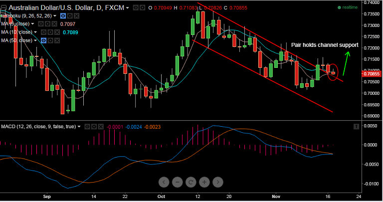 AUD/USD closed Monday's trade above channel support at 0.7085.