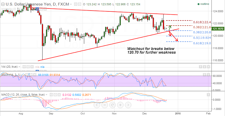 - Watchout for breaks below trendline support at 120.70 for further weakness, pair could then target 120 levels and further below 119, if the pair holds support at 120.70, test of 121.65 likely