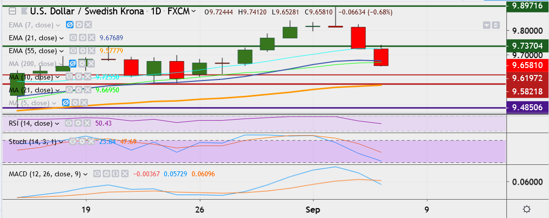 - On the lower side, support is seen at 9.6223 (August 27 Low), break below could take it till 9.5748 (55-EMA).