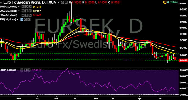 We prefer to take short position in EUR/SEK at 9.1520, stop loss 9.1633 and target 9.1437/ 9.1273 marks.