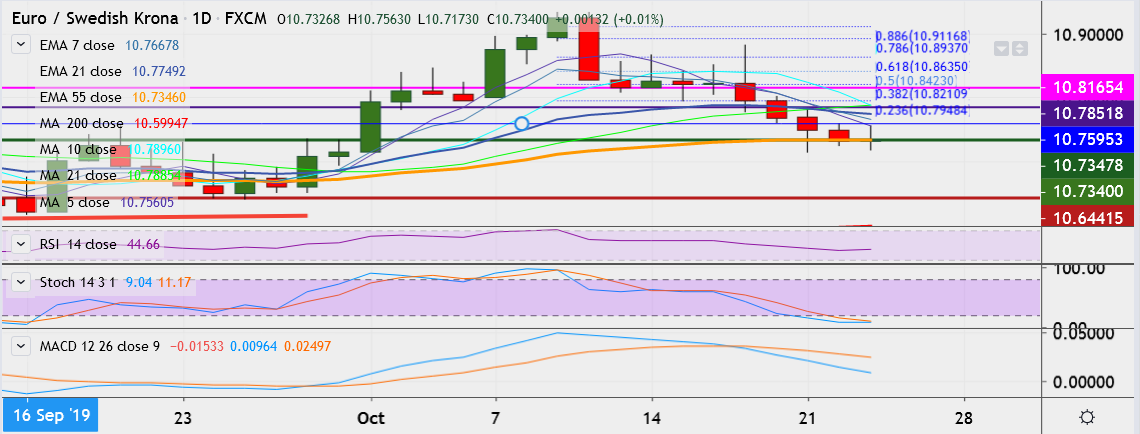 - EUR/SEK trades down at 10.7292, having hit a low of 10.7141 on Monday, its lowest since October 1.
