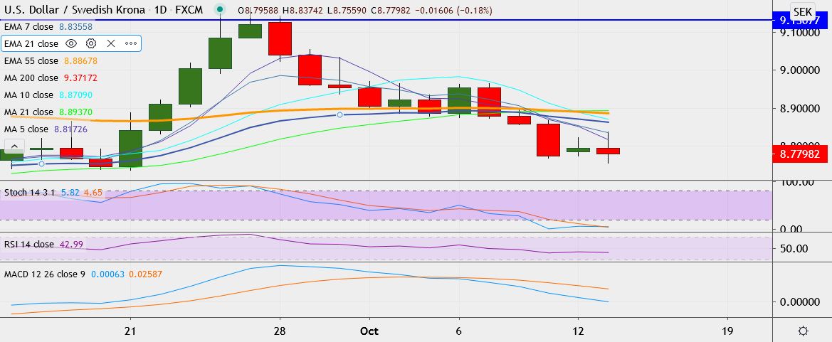 - USD/SEK trades 0.2 percent lower at 8.7774, having hit a low of 8.7559 earlier, its lowest since September 22.