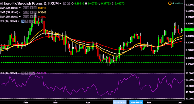 We prefer to take long position in EUR/SEK around 9.40, stop loss 9.3636 and target 9.4399/ 9.4572 marks.