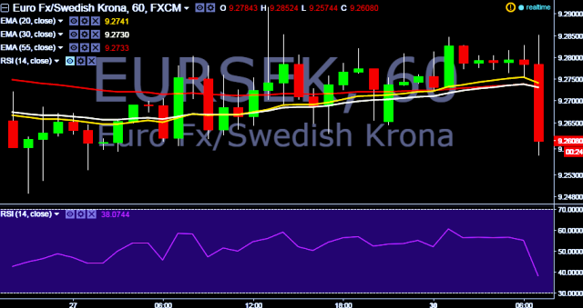 We prefer to take long position in EUR/SEK around 9.2625, stop loss 9.25 and target of 9.2953 marks.