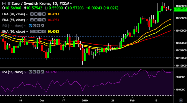 - EUR/SEK is currently trading around 10.5712 levels.