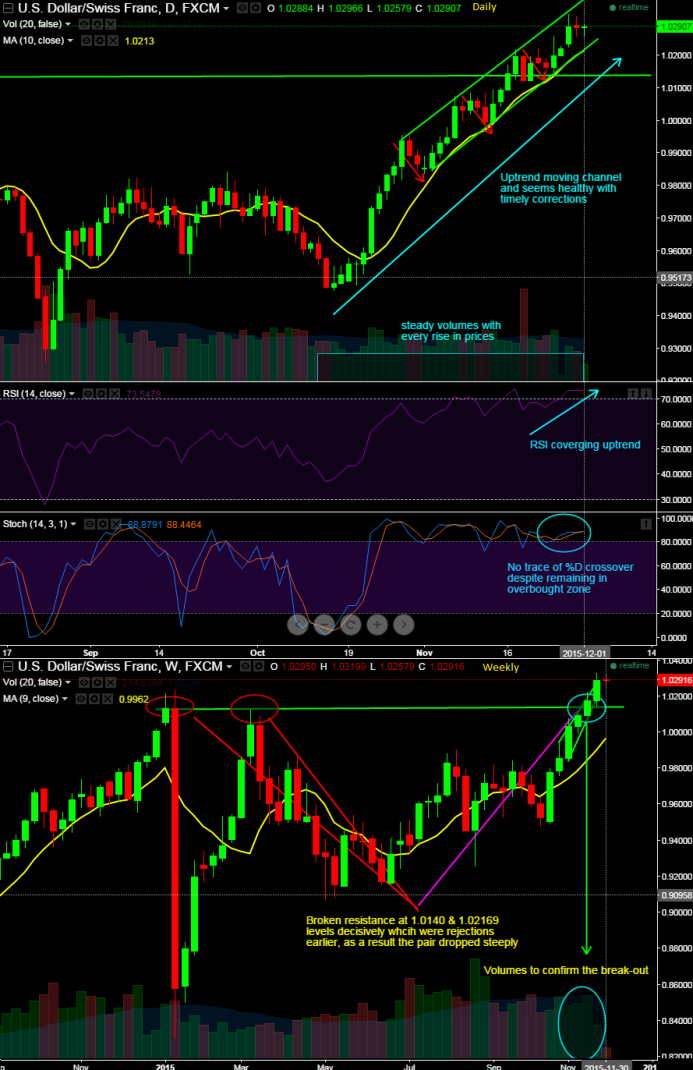 It has been a strong uptrend for dollar against Swiss franc for last one month or so, and moreover we believe today's sluggish set of economic numbers are not going to help Swiss franc in any manner.