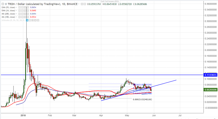 - Tron is continuing its minor weakness and has declined more than 45% from the high of $0.1023 made on Apr 30th 2018. Overall the pair jumped almost 350% from the low of 0.02280 made on Apr 1st 2018 low. Market expects biggest project yet from TRON foundation in approximately one day 13 hours for launch of MainNet. TRON would be free from its current Ethereum block chain and upgrading to its own MainNet. TRON gets listed in OEX exchange today before launch of MainNet. TRON has got lot of support from exchange platform for its MainNet launch (totally 19 exchange platform).