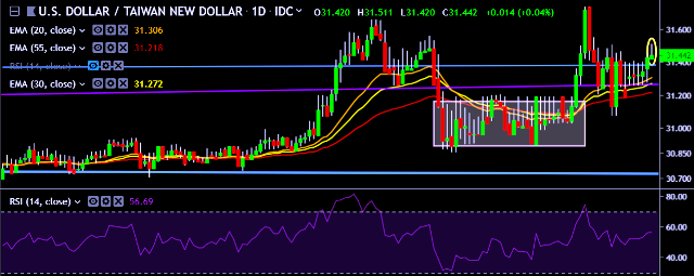 We prefer to take long position on USD/TWD around 31.40, stop loss at 31.22 and target of 31.90.