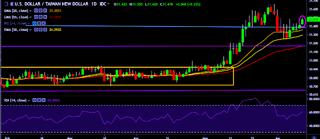 We prefer to take long position on USD/TWD only above 31.50, stop loss at 31.20 and target of 31.90.