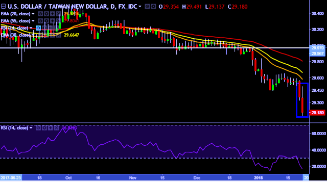 We prefer to take short position in USD/TWD around 29.25, stop loss at 29.65 and target of 29.04/28.77.