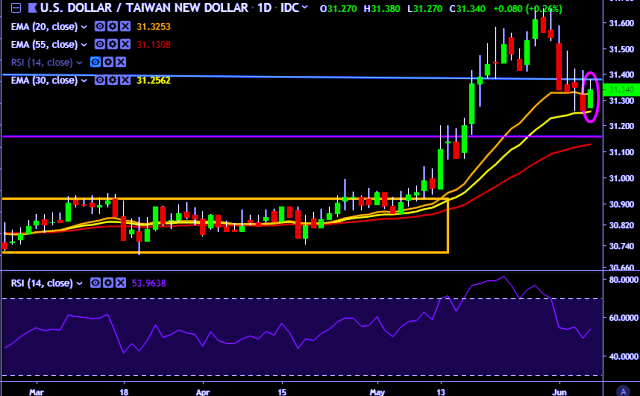 We prefer to take long position on USD/TWD around 31.30, stop loss at 31.20 and target of 31.70.