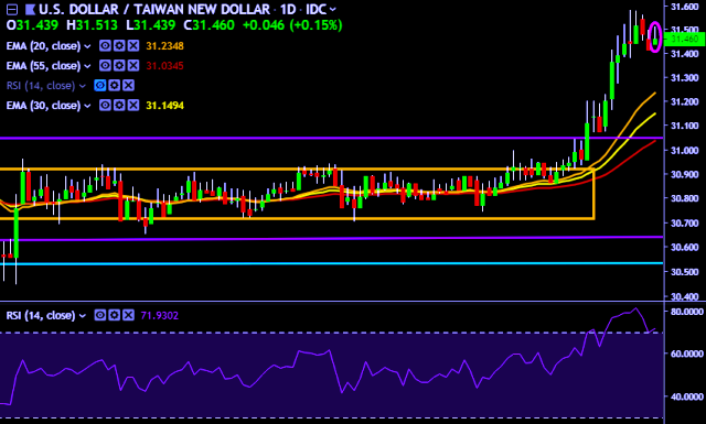 We prefer to take long position on USD/TWD only above 31.60, stop loss at 31.40 and target of 31.90.