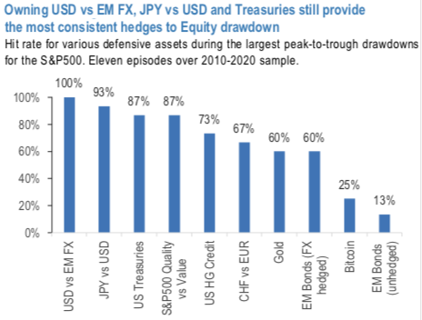 Holding defensive currencies like JPY vs USD and USD vs EM has delivered in 90-100% of Equity drawdowns given the tendency of funding currencies to be bought back when macro/market volatility rise and carry trades are unwound (refer above chart). The Swiss franc rises less consistently (67% of episodes), perhaps because it is not so universally used as yen or US dollars as a funding vehicle.