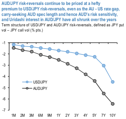 AUDJPY risk-reversals continue to be priced at a sizeable premium to USDJPY across expiries, most notably in longer maturities (2Y - 10Y, refer above chart). AUDJPY 5Y riskies for instance trade at a 0.8v premium (for JPY calls) over the arithmetic sum of 5Y AUDUSD and USDJPY riskies, which is not an unusual historical occurrence by any stretch but nonetheless suggests a lingering fear of GFC-like non-linearity / discontinuity in the behavior of the underlying spot. We are not convinced that this premium is justified for a number of reasons: