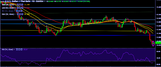 We prefer to take long position on USD/THB only above 30.90, stop loss at 30.70 and target of 31.20.