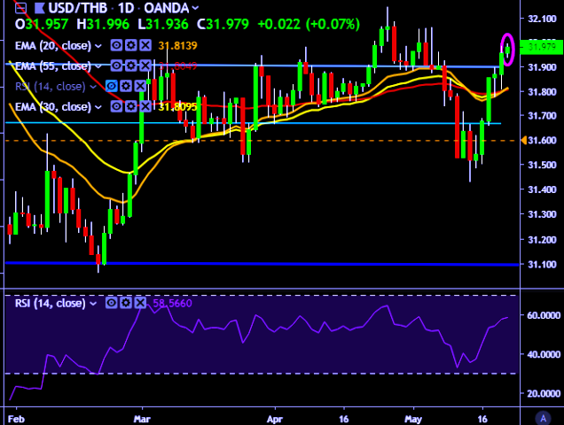 We prefer to take long position on USD/THB around 31.90, stop loss at 31.70 and target of 32.22.