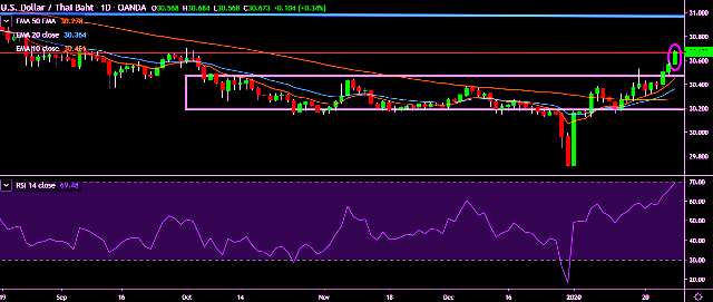 We prefer to go long on USD/THB around 30.64, stop loss at 30.50 and target of 30.97.