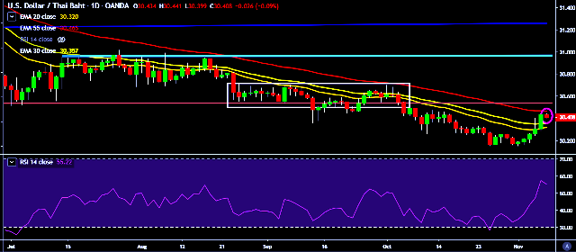 We prefer to go long on USD/THB only above 30.44, stop loss at 30.25 and target of 30.72/30.97.