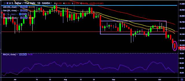 We prefer to go short on USD/THB around 30.30, stop loss at 30.48 and target of 30.02.
