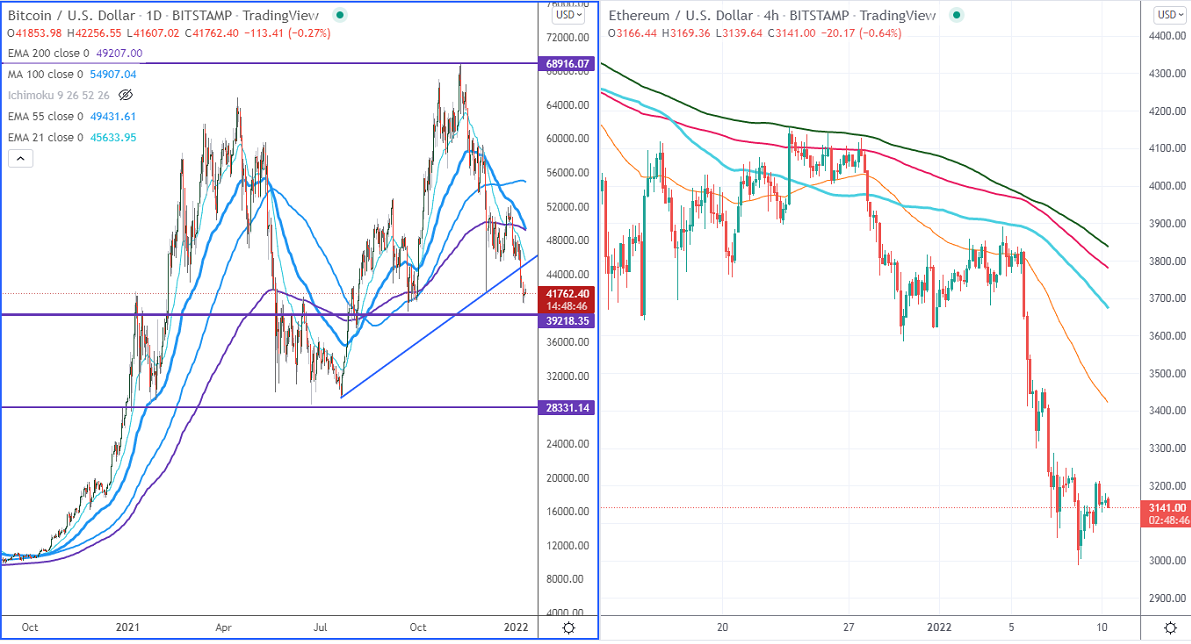 BTCUSD breaks significant support $41967 low made on Dec 4th, 2021, and hits a low of $40512. The pair is trading weak for the third consecutive week. It is currently trading around $41785.