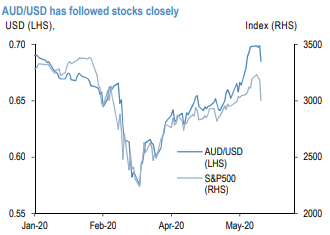 AUD has outperformed our forecasts, tracing the global equity rally (refer 1st chart). We have turned short dollars in the global strategy portfolio, and as a trading view, if the growth rebound remains directionally on track, then AUD will be supported to an extent. Iron ore prices are high, and the Australian economy is advancing out of the activity trough a month or two earlier than expected. Still, we see the more persistent components of the COVID-19 shock as challenging Australia’s medium term growth model more than most other DMs. We raise our near-term targets, but maintain a downward slope to the projections. Q’2020 target is at 0.66 levels (previously 0.65).