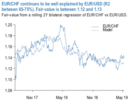 In the absence of an escalation of the trade conflict, EURCHF will likely remain extremely well behaved with respect to EURUSD. Movements in the euro generally explain between 65-75% of the behavior of EURCHF. The fair-value for EURCHF based on EURUSD is between 1.12-1.13 (the former using an 8Y regression window, the latter based on a 2Y period – refer 1stchart). The medium-term fundamental factors which support CHF are still intact in our opinion.