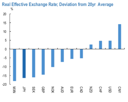 1) President Trump's criticism of JPY weakness: If President Trump mentions the extent to which JPY is undervalued and tries to put upward pressure on JPY, JPY could strengthen a fair bit in the short term. It can be argued that JPY is considerably more undervalued than EUR or CNY, as its real trade-weighted value is 16% below its 20- year average (refer 1stchart).