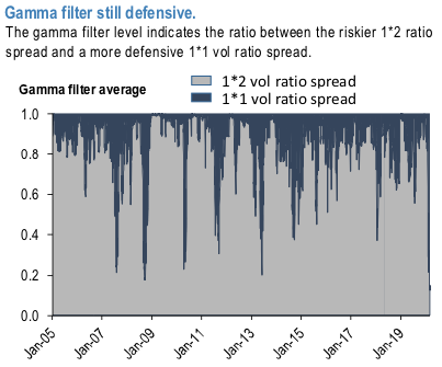 To solve the left tail issue we follow on the heels of our prior work on gamma trading filter (Total-return version of tactical filter allowing long Gamma trades) and utilize the filter in vol ratio spreads trading. The model relies on a set of common global indicators and along it currency specific variables that assess level of risk-aversion in the broad markets. We use the gamma timing filter to determine the notionals split between 1*2 vega ratio spreads and M/N (market neutral) ratio spread. The G10 average filter signal as given in the 1st chart is always within (0,1) range. The value of e.g. 0.75 means that 75% of the notional goes toward 1*2 and 25% into M/N risk ratio structure.